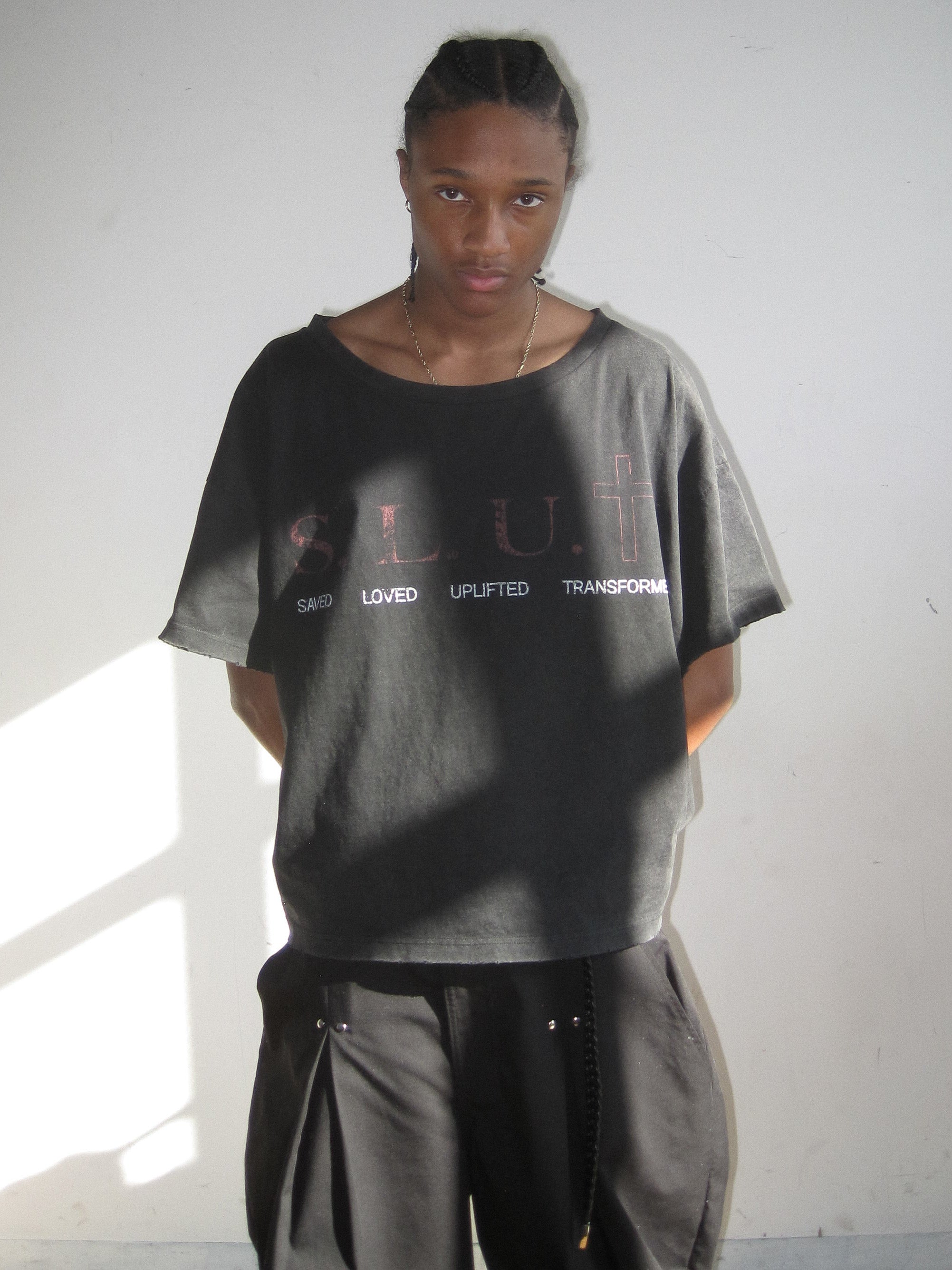 SHORT SLEEVE TEE SHIRT MADE OF 100% 5.6OZ COTTON JERSEY. DROP SHOULDER, WIDE-ON-HIPS, ABOVE THE WAIST FIT. ELONGATED RIBBED NECKLINE. VINTAGE WASH PROCESS. PRINTED ARTWORK ON FRONT.